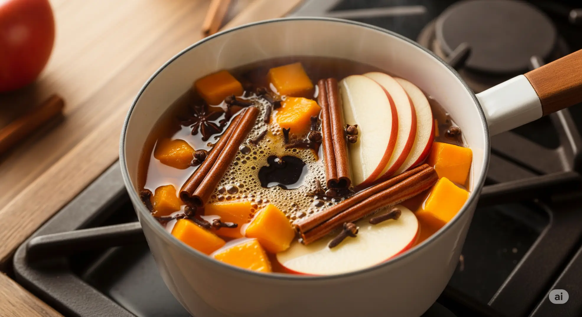 - Τοποθετείτε τα υλικά σε μία μικρή κατσαρόλα και ανακατεύετε. Στη συνέχεια, τα αφήνετε να πάρουν μία βράση και μειώνετε τη θερμοκρασία. Αν χρειάζεται, προσθέτετε επιπλέον μηλίτη.