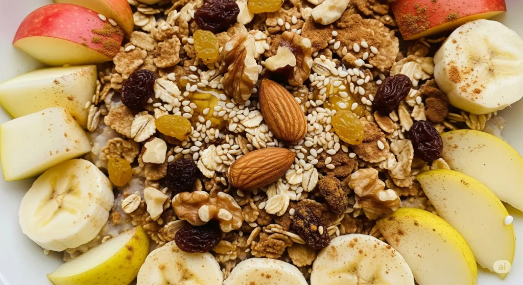 ΥΛΙΚΑ : 125 ml γάλα 1,5% 125 ml νερό 2 κ.σ. νιφάδες δημητριακών πρωινού 2 κ.σ. νιφάδες βρώμης 1 κ.γ. σταφίδες 1 κ.σ. ξηρούς καρπούς 2 κ.γ. κοφτά κακάο ( προαιρετικά ) 1 μικρό φρούτο ψιλοκομμένο ( μήλο, 1/2 μπανάνα, αχλάδι ) κανέλα 1 κ.γ. καρβουδισμένο σουσάμι ( προαιρετικά ) 1 κ.γ. μέλι ΕΚΤΕΛΕΣΗ :